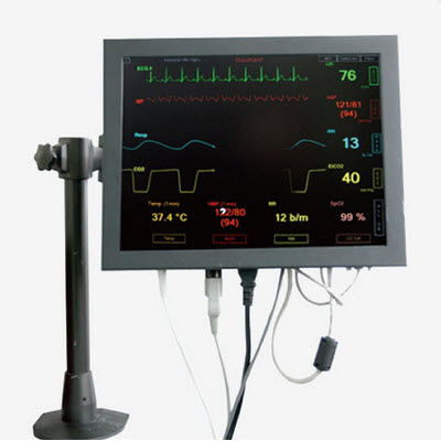 ■LCD屏幕提供12导联心电图、血氧饱和度、呼吸、二氧化碳、血压(动脉血压、静脉压、肺动脉压、无创血压)、心输出量等