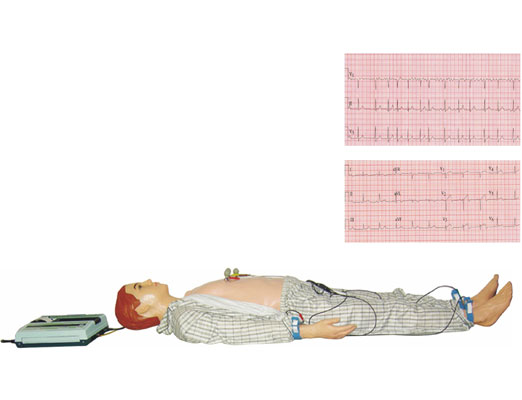 • 教学实习或考核时在仿真模拟人面板上操作代码按钮,根据教学需要输入某心电图的代码,通过心电图机或心电监护仪便能自动描绘这一心电特征波形。