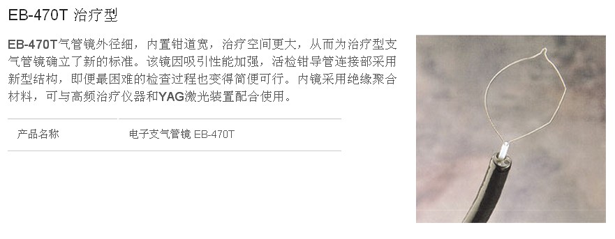 EB-470T气管镜外径细,内置钳道宽,治疗空间更大,从而为治疗型支气管镜确立了新的标准。该镜因吸引性能加强,活检钳导管连接部采用新型结构,即便困难的检查过程也变得简便可行。内镜采用绝缘聚合材料,可与高频治疗仪器和YAG激光装置配合使用。
